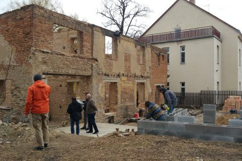 Stavebních prací se ujala firma NEO BUILDER a.s., která vyhrála výběrové řízení. „V první řadě bylo nutné objekt vyklidit a vyčistit přilehlý dvůr a zahradu a zahrady od lety nahromaděného nepořádku a náletových dřevin,“ popisuje Stanislav Fiala z Arcidiecézní charity Praha, „následovaly demoliční práce – odstranění zchátralé střechy, krovů, stropních konstrukcí a nestabilního zdiva. Pak přišlo na řadu oplocení pozemku. V současné době probíhají především práce na kanalizačních přípojkách, budování nových základů a výstavby přilehlé kočárkárny.“